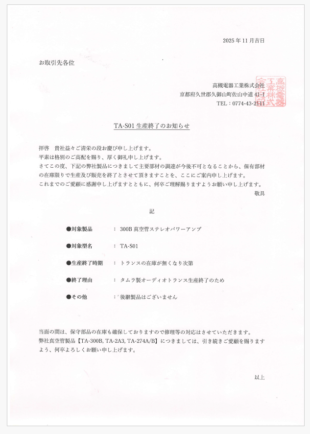 【TA-300B,TA-2A3,TA-274A/B】につきましては、引き続きご愛顧を賜りますよう、何卒よろしくお願い申し上げます。